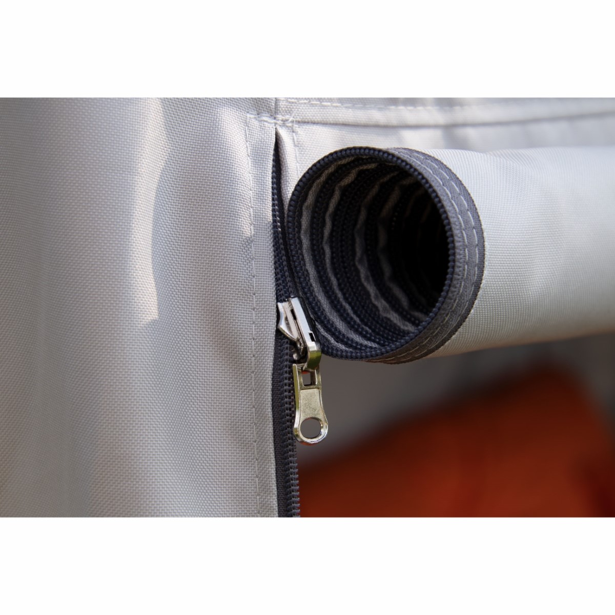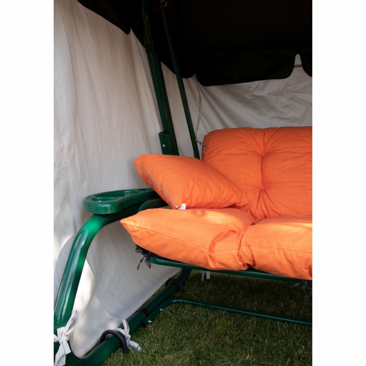 Dzięki takiemu rozwiązaniu, przednią ściankę można zrolować i bez przeszkód korzystać z huśtawki nawet w czasie deszczu.