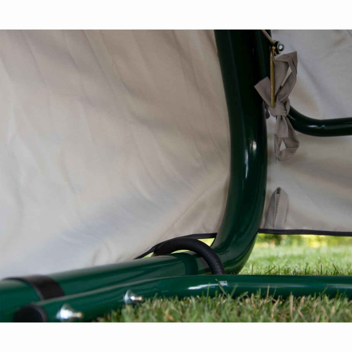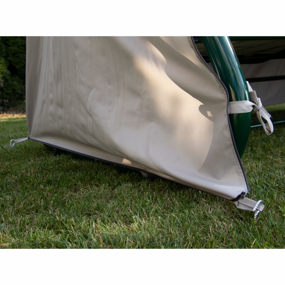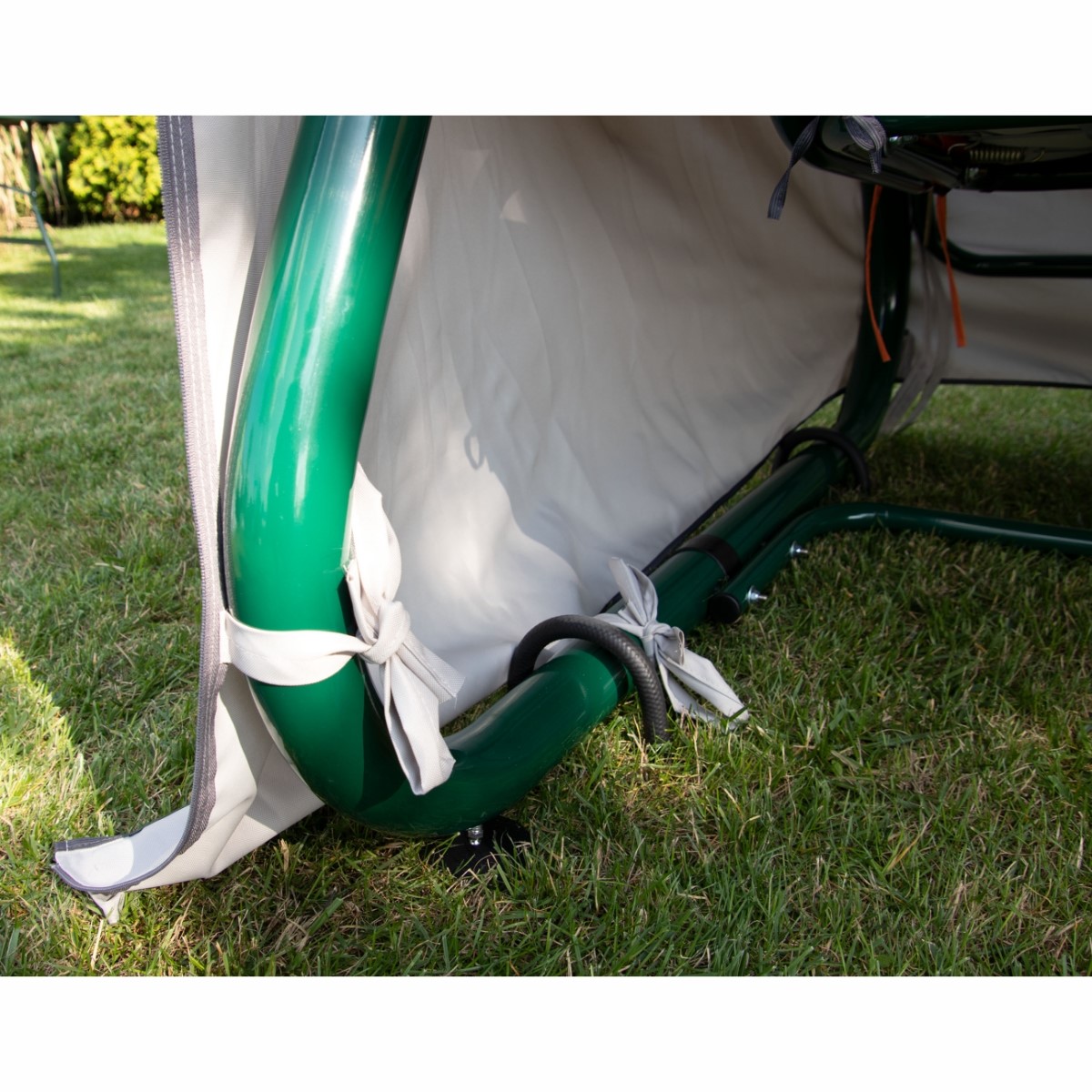 Zapinany na zamki umieszczone po obu stronach huśtawki, dodatkowo przywiązywany do jej nóżek.