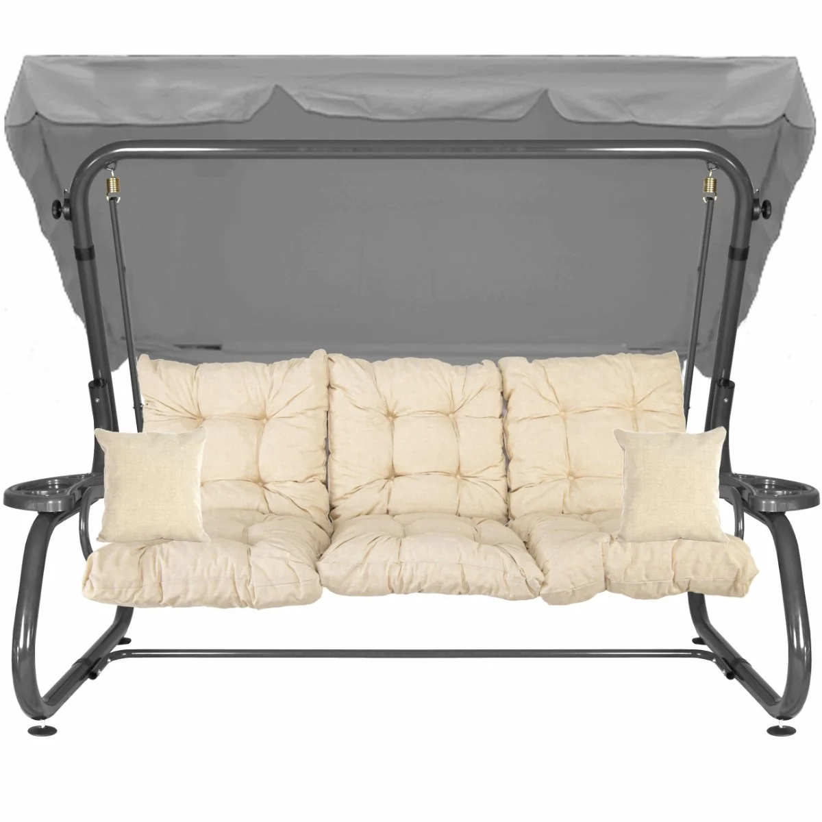 Na siedzisku i oparciu zamontowano system sprężyn z płaskownikami (ocynk), który zapewnia komfort wypoczynku i długotrwałe użytkowanie huśtawki.